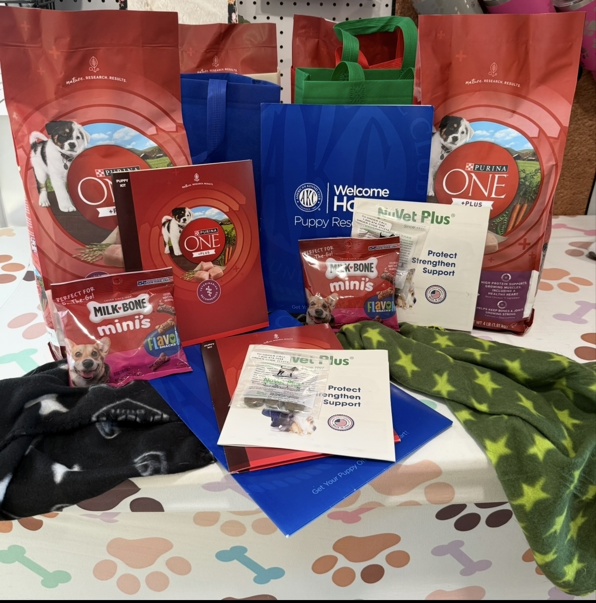 At puppy pick up, you will receive a puppy kit. In your puppy kit you will find the AKC registration papers, health records showing all deworming and vaccinations, a full report from the vet during the 8 week health exam, microchipping registration, a sample bag of current kibble and treats.